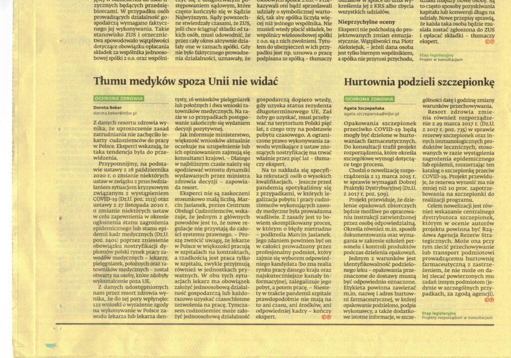 Marcin Jasianek – prezes Centrum Obsługi Cudzoziemców udzielił eksperckiej wypowiedzi dla Gazety Prawnej. Komentarz dotyczył sytuacji prawnej Cudzoziemców w związku z rynkiem pracy w branży medycznej.
